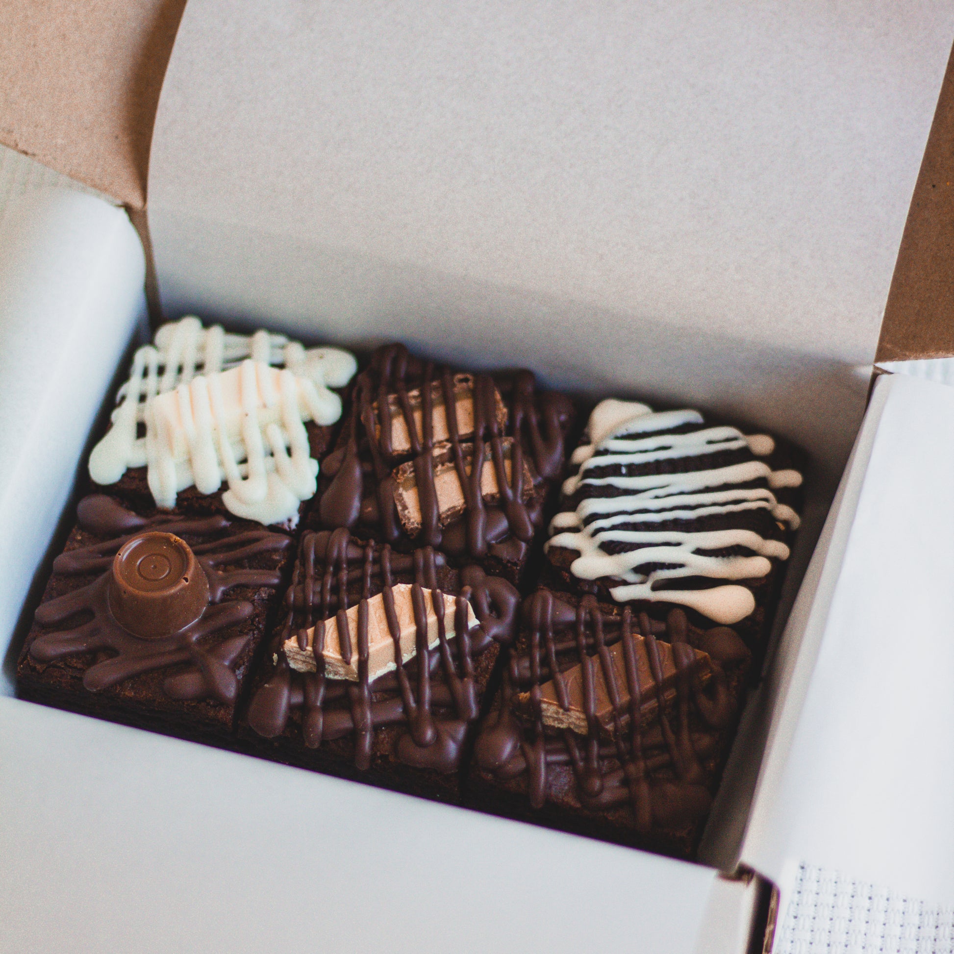 The box consists of Chocolate Brownies with the following toppings: